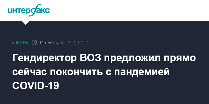 Москва. 14 сентября. INTERFAX.RU - Гендиректор Всемирной организации здравоохранения Тедрос Адханом Гебрейесус заявил, что сейчас складывается самая благоприятная ситуация для того, чтобы пандемия коронавируса завершилась.