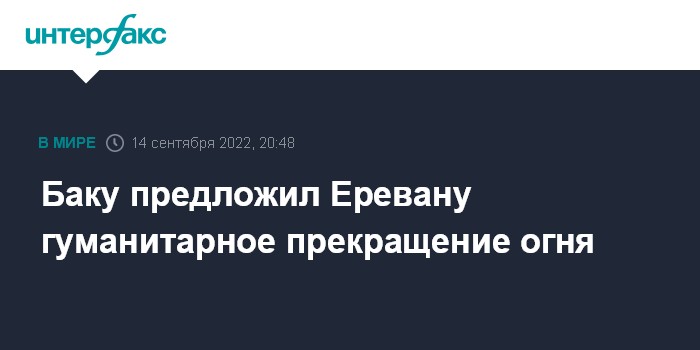 Москва. 14 сентября. INTERFAX.RU - Баку в одностороннем порядке предложил Еревану гуманитарное прекращение огня, заявил министр иностранных дел Азербайджана Джейхун Байрамов на встрече со спецпредставителем президента России по международному культурному сотрудничеству Михаилом Швыдким. Об этом говорится в сообщении МИД Азербайджана.