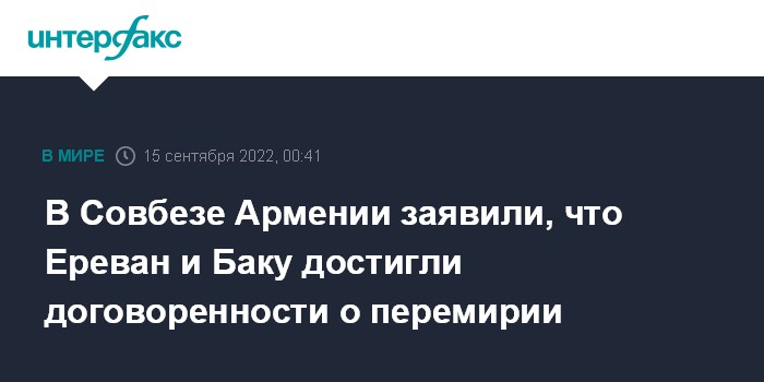Москва. 15 сентября. INTERFAX.RU - Армения и Азербайджан достигли договоренности о перемирии, заявил секретарь Совета безопасности Армении Армен Григорян.