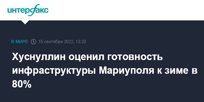 Москва. 15 сентября. INTERFAX.RU - Вице-премьер Марат Хуснуллин оценил готовность инфраструктуры Мариуполя к зиме в 80% и отметил, что с учетом имеющихся разрушений, это "неплохой результат".