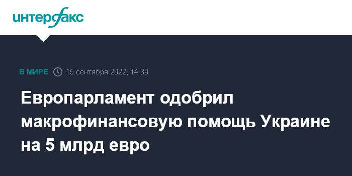 Москва. 15 сентября. INTERFAX.RU - Европарламент в четверг утвердил предложение Еврокомиссии о выделении Украине макрофинансового кредита в 5 млрд евро.