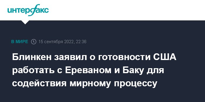 Москва. 15 сентября. INTERFAX.RU - Госсекретарь США Энтони Блинкен приветствовал прекращение боестолкновений между Азербайджаном и Арменией на границе, заявил о приверженности Вашингтона содействию мирному процессу на Южном Кавказе.