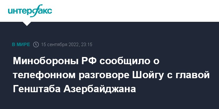 Москва. 15 сентября. INTERFAX.RU - Министр обороны РФ Сергей Шойгу провел телефонный разговор с начальником Генштаба Азербайджана Керимом Велиевым, сообщило Минобороны РФ в четверг.