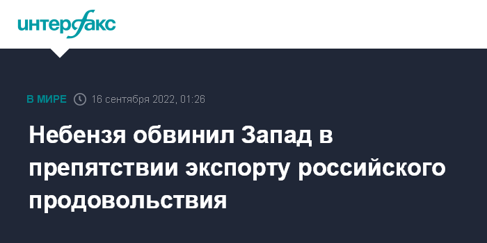 Гутерриш обсудил с Путиным вывоз зерна с Украины и экспорт продовольствия из РоссииЧитать подробнее"С реализацией этого документа пока имеются большие сложности, так как нашим поставкам препятствует незаконные односторонние санкции. Повторяемый Евросоюзом и США тезис о том, что их санкции не мешают экспорту продовольствия и удобрений, не соответствуют реальности". - сказал Небензя, выступая на заседании Совета Безопасности ООН.