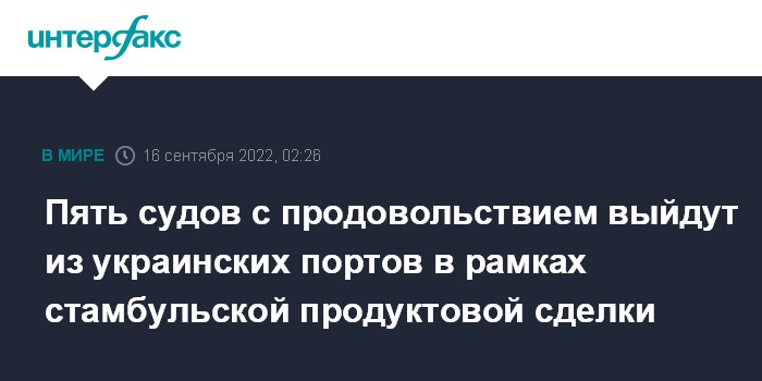 Москва. 16 сентября. INTERFAX.RU - Из украинских портов в пятницу планируют выйти пять судов с продовольствием в рамках черноморской зерновой инициативы, получив разрешение на это от совместного координационного центра (СКЦ), сообщает ООН.