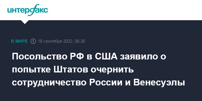 Москва. 16 сентября. INTERFAX.RU - Посольство России в США в комментарии относительно заявлений представителя госдепартамента на сенатских слушаниях по Венесуэле подчеркнуло, что американская сторона пытается очернить сотрудничество РФ с Венесуэлой, чтобы скрыть собственное деструктивное влияние на эту страну.