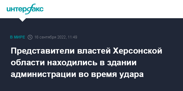 Москва. 16 сентября. INTERFAX.RU - В здании военно-гражданской администрации (ВГА) Херсонской области, которое подверглось в пятницу ракетному удару, находились министры и члены ВГА, сообщили журналистам в администрации.