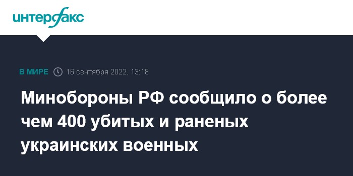 Москва. 16 сентября. INTERFAX.RU - В результате российских ударов по позициям украинских войск в Николаевской, Харьковской областях и Донецкой народной республике (ДНР) убиты и ранены свыше 400 человек, заявил официальный представитель Минобороны РФ Игорь Конашенков.