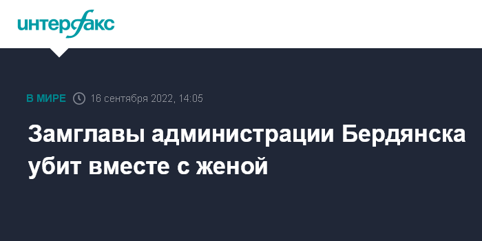 Москва. 16 сентября. INTERFAX.RU - Двойное убийство совершено в Бердянске на подконтрольной РФ части Запорожской области, жертвами стали замглавы администрации по ЖКХ и его жена - руководитель местного избиркома, сообщили в городской администрации.