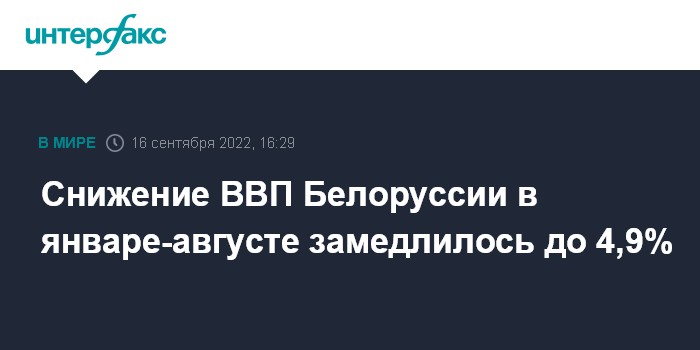 Москва. 16 сентября. INTERFAX.RU - ВВП Белоруссии в январе-августе 2022 года составил 122 млрд белорусских рублей, что в сопоставимых ценах на 4,9% меньше, чем в январе-августе прошлого года. Об этом сообщил Национальный статистический комитет (Белстат).