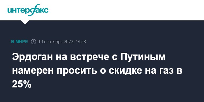 Москва. 16 сентября. INTERFAX.RU - Президент Турции Реджеп Тайип Эрдоган в пятницу на встрече с российским коллегой Владимиром Путиным планирует запросить скидку в 25% за российский газ и возможность оплаты части поставок в турецкой лире, передает Bloomberg со ссылкой на высокопоставленного турецкого чиновника.