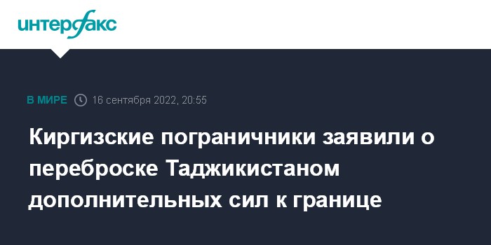 Москва. 16 сентября. INTERFAX.RU - Киргизские пограничники фиксируют переброску Таджикистаном сил и средств к границам Киргизии. Об этом сообщает в пятницу Погранслужба Госкомитета национальной безопасности страны.