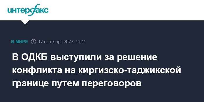 Москва. 17 сентября. INTERFAX.RU - В ОДКБ внимательно следят за ситуацией на киргизско-таджикской границе, выступают за решение конфликта путем переговоров, заявили в секретариате организации.