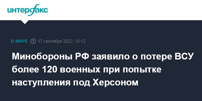 Москва. 17 сентября. INTERFAX.RU - Украинские силы предприняли попытку наступления в Херсонской области, потеряли более 120 человек и семь танков, сообщил официальный представитель Минобороны РФ Игорь Конашенков.
