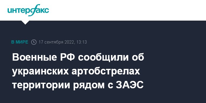 Москва. 17 сентября. INTERFAX.RU - Министерство обороны России сообщило о двух артиллерийских обстрелах территории рядом с Запорожской АЭС.
