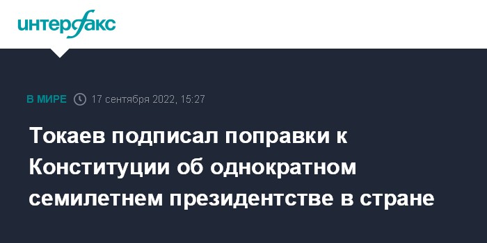 Москва. 17 сентября. INTERFAX.RU - Президент Казахстана Касым-Жомарт Токаев подписал закон "О внесении изменений и дополнений в Конституцию", сообщила в субботу пресс-служба главы государства.