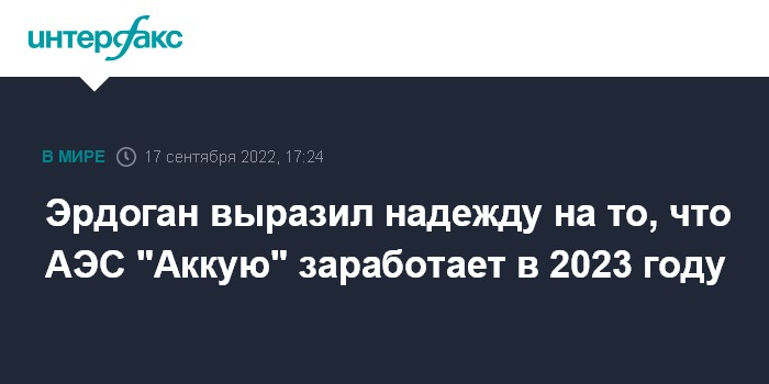 Москва. 17 сентября. INTERFAX.RU - Президент Турции Реджеп Тайип Эрдоган заявил, что рассчитывает на запуск первого реактора на строящейся АЭС "Аккую" в 2023 году.