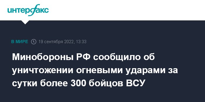 Москва. 19 сентября. INTERFAX.RU - В ходе специальной военной операции на Украине за минувшие сутки уничтожены более 300 военнослужащих противника, сообщил официальный представитель Министерства обороны РФ Игорь Конашенков на брифинге в понедельник.