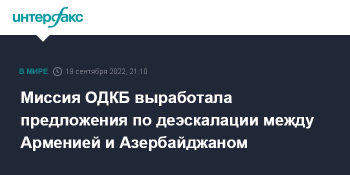 Москва. 19 сентября. INTERFAX.RU - Передовая группа миссии ОДКБ выработала предложения по деэскалации напряженности на армяно-азербайджанской границе. Об этом сообщили журналистам в понедельник в пресс-службе Объединенного штаба ОДКБ.