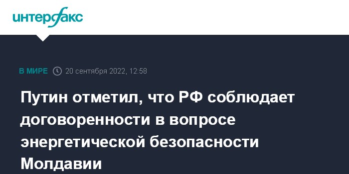 Москва. 20 сентября. INTERFAX.RU - Россия действует в строгом соответствии с двусторонними договорённостями в вопросах энергетической безопасности Молдавии, заявил президент РФ Владимир Путин.