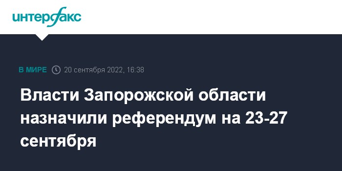 Москва. 20 сентября. INTERFAX.RU - Референдум по вопросу территориальной принадлежности Запорожской области пройдет с 23 по 27 сентября, сообщил глава военно-гражданской администрации (ВГА) региона Евгений Балицкий.