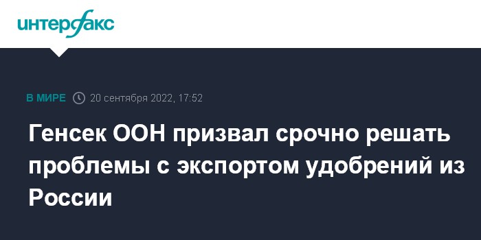 Москва. 20 сентября. INTERFAX.RU - Для улучшения кризисной ситуации с продовольствием в мире необходимо в срочном порядке решать проблемы с поставками удобрений, заявил генсек ООН Антониу Гутерриш, выступая во вторник на Генассамблее ООН.