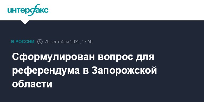 Москва. 20 сентября. INTERFAX.RU - На подконтрольной России территории Запорожской области на референдум 23-27 сентября будет вынесен на голосование один вопрос, следует из указа главы военно-гражданской администрации (ВГА) региона Евгения Балицкого.