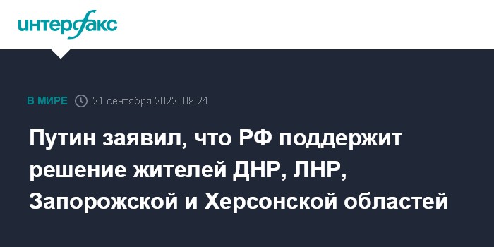 Путин заявил, что РФ поддержит решение жителей ДНР, ЛНР, Запорожской и Херсонской областей