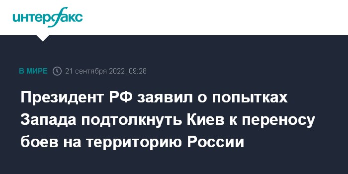 Москва. 21 сентября. INTERFAX.RU - В Вашингтоне, Лондоне и Брюсселе подталкивают Киев к переносу военных действий на территорию России, заявил президент РФ Владимир Путин.