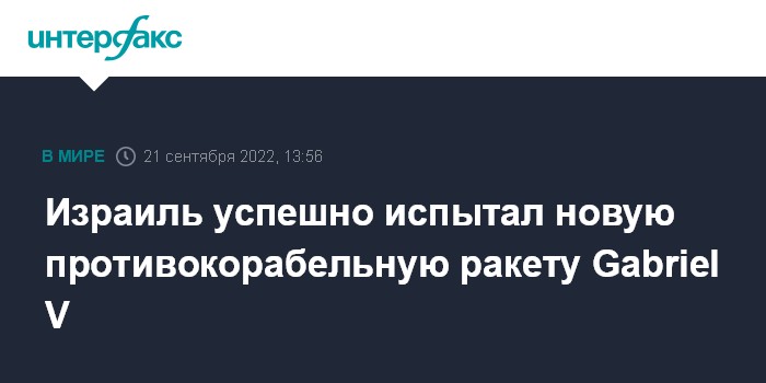 Москва. 21 сентября. INTERFAX.RU - Израильские ВМС на фоне разногласий Израиля и ливанского движения "Хезболла" по морской границе осуществили успешное испытание новой противокорабельной ракеты Gabriel V, сообщает в среду Times of Israel.