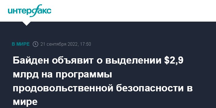 Москва. 21 сентября. INTERFAX.RU - Президент США Джо Байден позже в среду объявит, что Вашингтон для урегулирования проблемы продовольственной безопасности в мире выделит $2,9 млрд, сообщают американские СМИ со ссылкой на Белый дом.