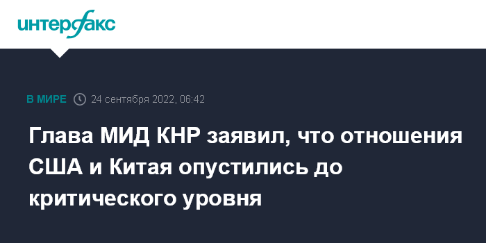 Москва. 24 сентября. INTERFAX.RU - Китайско-американские отношения в настоящее время переживают критический этап в результате китайской политики США, Вашингтону необходимо извлечь из этого соответствующие уроки, заявил министр иностранных дел КНР Ван И госсекретарю США Энтони Блинкену.