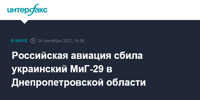Москва. 24 сентября. INTERFAX.RU - Российский истребитель сбил украинский МиГ-29 в небе над Днепропетровской областью, заявили в Минобороны РФ.