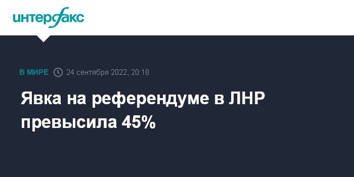 Москва. 24 сентября. INTERFAX.RU - Явка избирателей по итогам двух дней голосования на референдуме о вхождении Луганской народной республики в состав Российской Федерации составила 45,86%, сообщила председатель Центральной избирательной комиссии ЛНР Елена Кравченко.