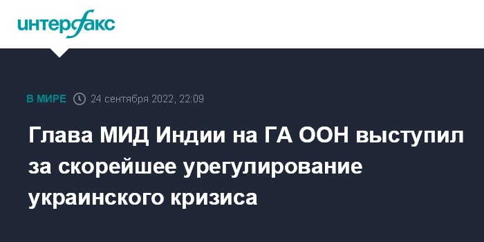 Москва. 24 сентября. INTERFAX.RU - Индия призывает проводить активную работу в рамках ООН и за ее пределами, чтобы как можно скорее урегулировать конфликт на Украине, заявил в субботу глава МИД Индии Субраманьям Джайшанкар, выступая на Генассамблее ООН.