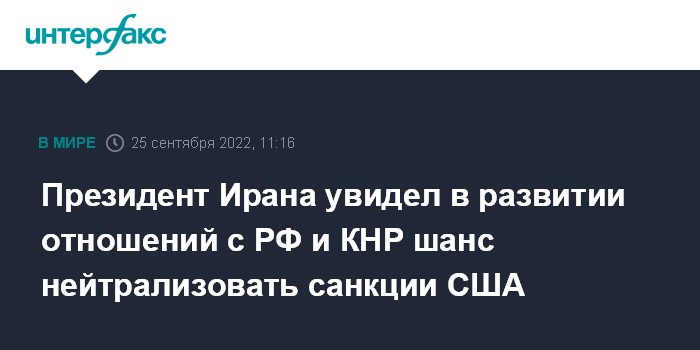 Москва. 25 сентября. INTERFAX.RU - Сотрудничество Ирана с РФ, КНР и другими государствами позволит преодолеть действие санкций США, заявил китайским СМИ "на полях" Генассамблеи ООН иранский президент Ибрахим Раиси.