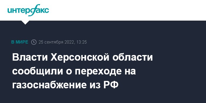 Москва. 25 сентября. INTERFAX.RU - Херсонская область перешла на газоснабжение с территории России и больше не зависит от газовой системы Украины, сообщил глава военно-гражданской администрации региона Владимир Сальдо.