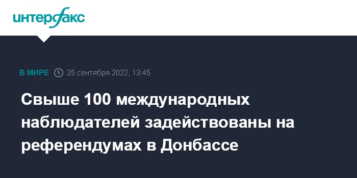 Москва. 25 сентября. INTERFAX.RU - Более 100 международных наблюдателей из 40 стран работают на референдумах в Донецкой и Луганской народных республиках, Запорожье и Херсоне, сообщили в Центризбиркоме России.