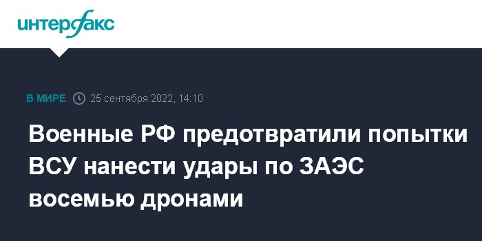 Москва. 25 сентября. INTERFAX.RU - Министерство обороны РФ сообщило, что российские военные сбили восемь украинских беспилотников, которыми хотели атаковать территорию Запорожской атомной электростанции.