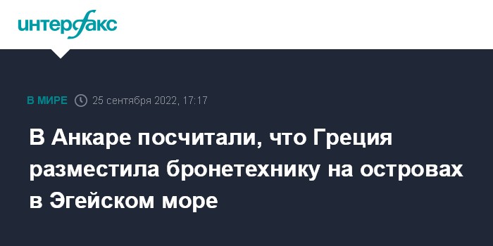 Москва. 25 сентября. INTERFAX.RU - Греческие военные доставили бронетехнику на демилитаризованные острова Греции в Эгейском море, что является нарушением международного права, сообщает в воскресенье Sabah со ссылкой на источники в турецких службах безопасности.