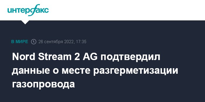 Москва. 26 сентября. INTERFAX.RU - Оператор газопровода "Северный поток 2" Nord Stream 2 AG, который ранее в понедельник сообщил об утечке газа, подтвердил данные датского регулятора о месте разгерметизации.