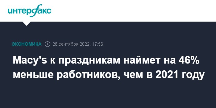 Москва. 26 сентября. INTERFAX.RU - Американская сеть универмагов Macy's Inc. планирует в 2022 году в преддверии рождественских праздников нанять чуть более 41 тысячи сезонных работников, сообщила компания.