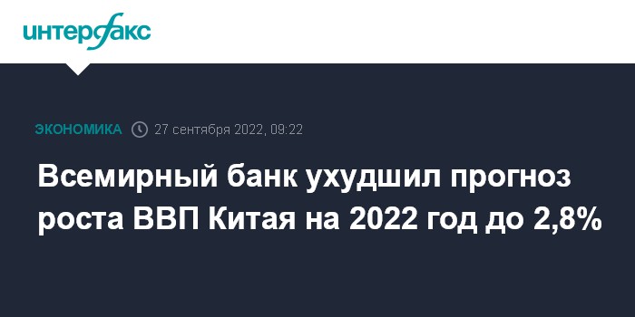 По новому прогнозу ВБ, ВВП КНР увеличится на 2,8% в 2022 году и на 4,5% - в следующем. В июне ожидался подъем на 4,3% и 5,2% соответственно.