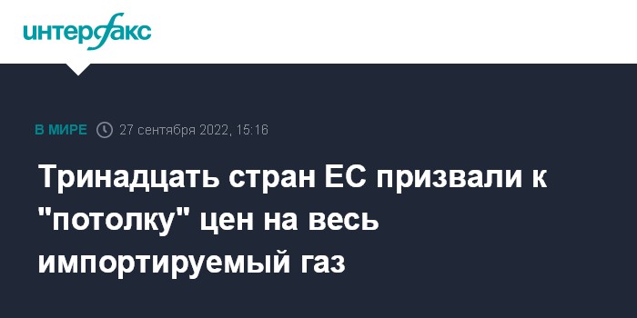 Москва. 27 сентября. INTERFAX.RU - Группа из 13 стран ЕС в письме, адресованном руководству Евросоюза, призвали ко введению потолка цен на любой импортируемый газ, пишет во вторник итальянская газета Il Sole 24 Ore.