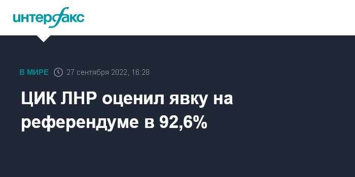 Москва. 27 сентября. INTERFAX.RU - Голосование на референдуме о вхождении Луганской народной республики в состав Российской Федерации завершилось, итоговая явка избирателей составила 92,6%, сообщила председатель Центральной избирательной комиссии ЛНР Елена Кравченко.