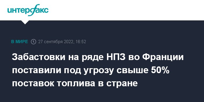 Москва. 27 сентября. INTERFAX.RU - Рабочие четырех нефтеперерабатывающих заводов во Франции вышли на забастовку, в результате чего под угрозой оказалось более половины поставок топлива в стране.