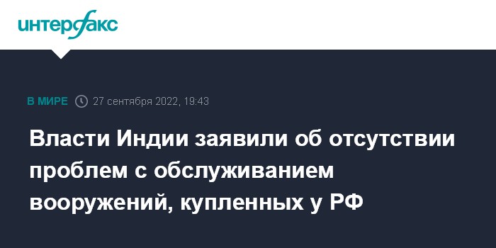 Москва. 27 сентября. INTERFAX.RU - У Индии за последние месяцы не было ощутимых проблем с обслуживанием вооружений, поставленных Россией, заявил во вторник глава МИД Индии Субраманьям Джайшанкар на пресс-конференции с госсекретарем США Энтони Блинкеном.