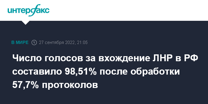 Число голосов за вхождение ЛНР в РФ составило 98,51% после обработки 57,7% протоколов