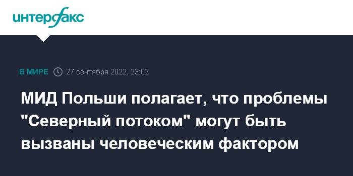 Москва. 27 сентября. INTERFAX.RU - Министр иностранных дел Польши Збигнев Рау не исключил, что проблемы с газопроводами "Северный поток" вызваны человеческим фактором.