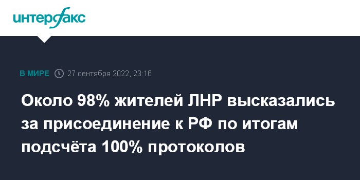 Москва. 27 сентября. INTERFAX.RU - 98,42% жителей Луганской народной республики проголосовали за вхождение ЛНР в состав Российской Федерации, сообщила председатель Центральной избирательной комиссии ЛНР Елена Кравченко по итогам подсчёта 100% бюллетеней.